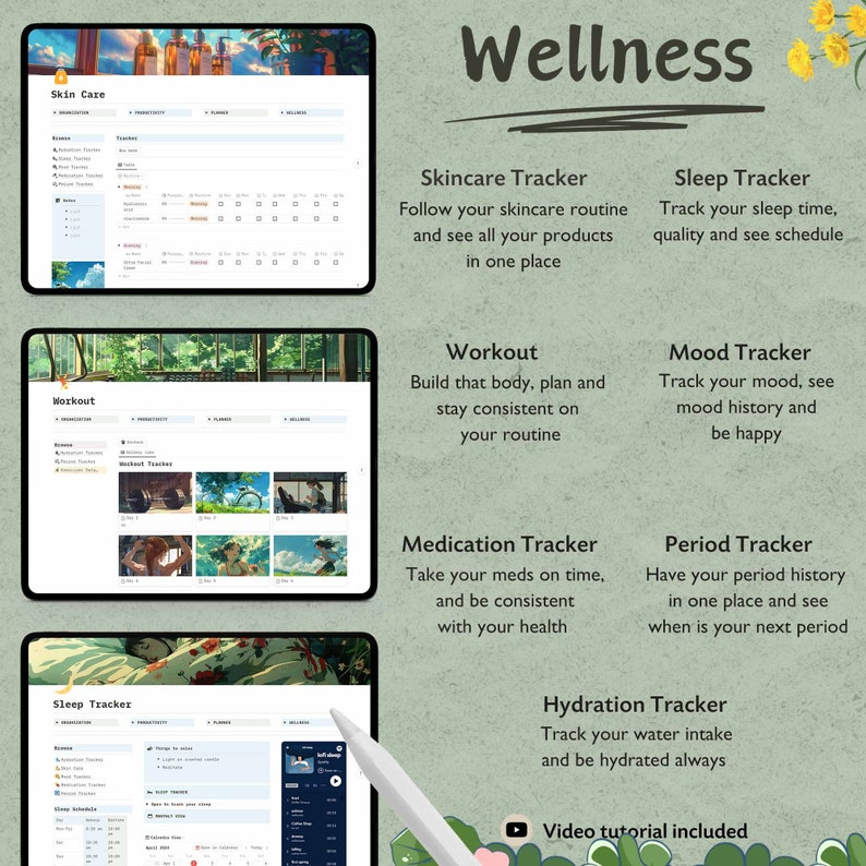 Workout, Hydration Tracker, Sleep Tracker, Skincare Tracker, Mood Tracker, Medication Tracker, Period Tracker.
